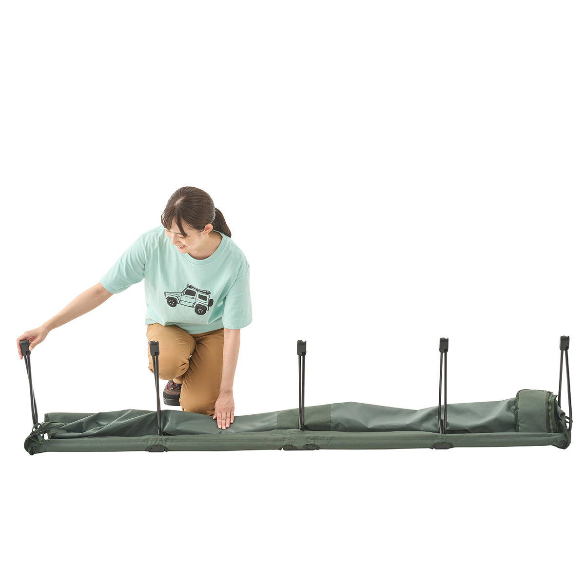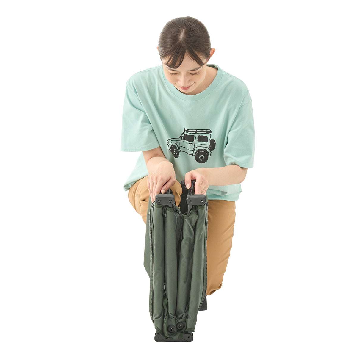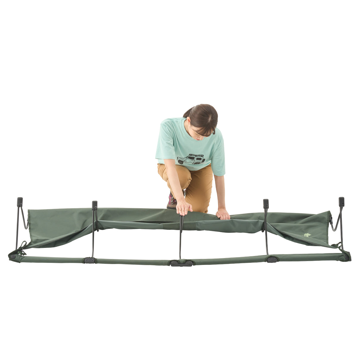 ジッパー開閉組み立て式を採用したローコットは、フレームと生地が一体式のため、手間なく簡単かつスピーディーに設営&撤収できる。